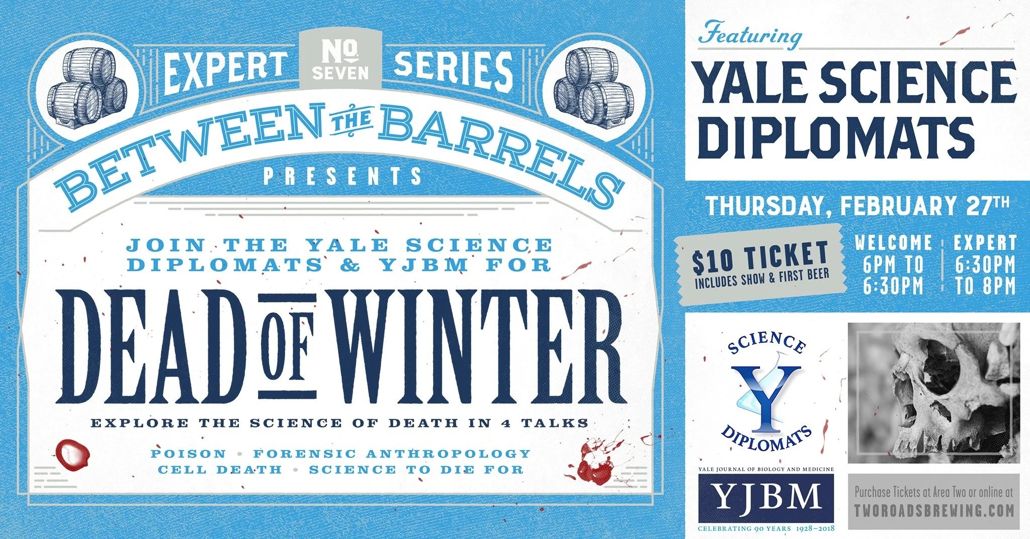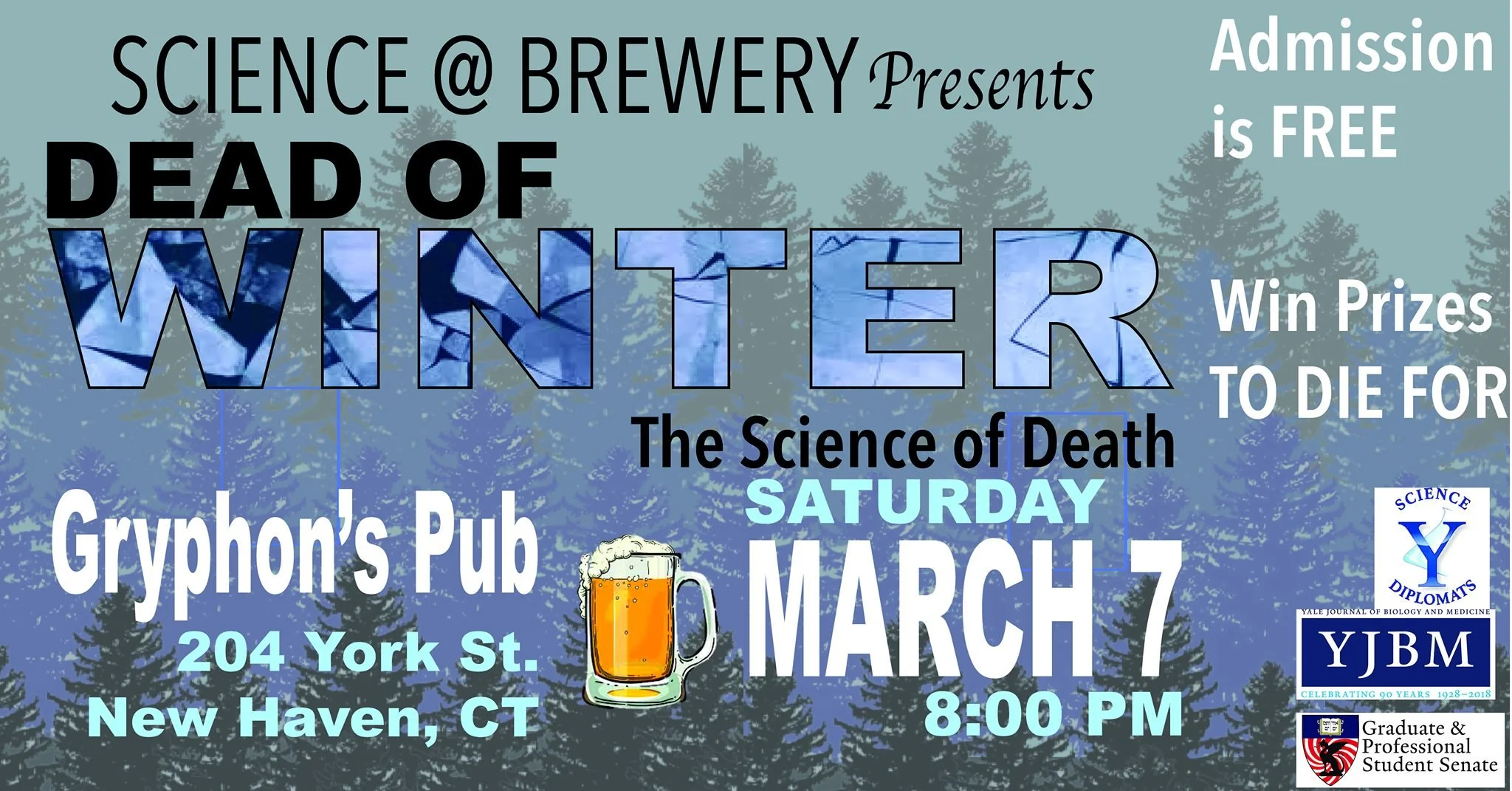 All talks were given twice, once at a Brewery and once at Gryphon’s Pub (the Yale Graduate Student Bar). Hosting at East Rock Brewery broadened our reach to include patrons who happened to walk in that day. At Two Roads, we worked with the “Between The Barrels Expert Series” organizers and sold out all tickets in advance. Below are a collection of event flyers. CLICK HERE TO HEAR A PODCAST RECORDING OF DEAD OF WINTER.